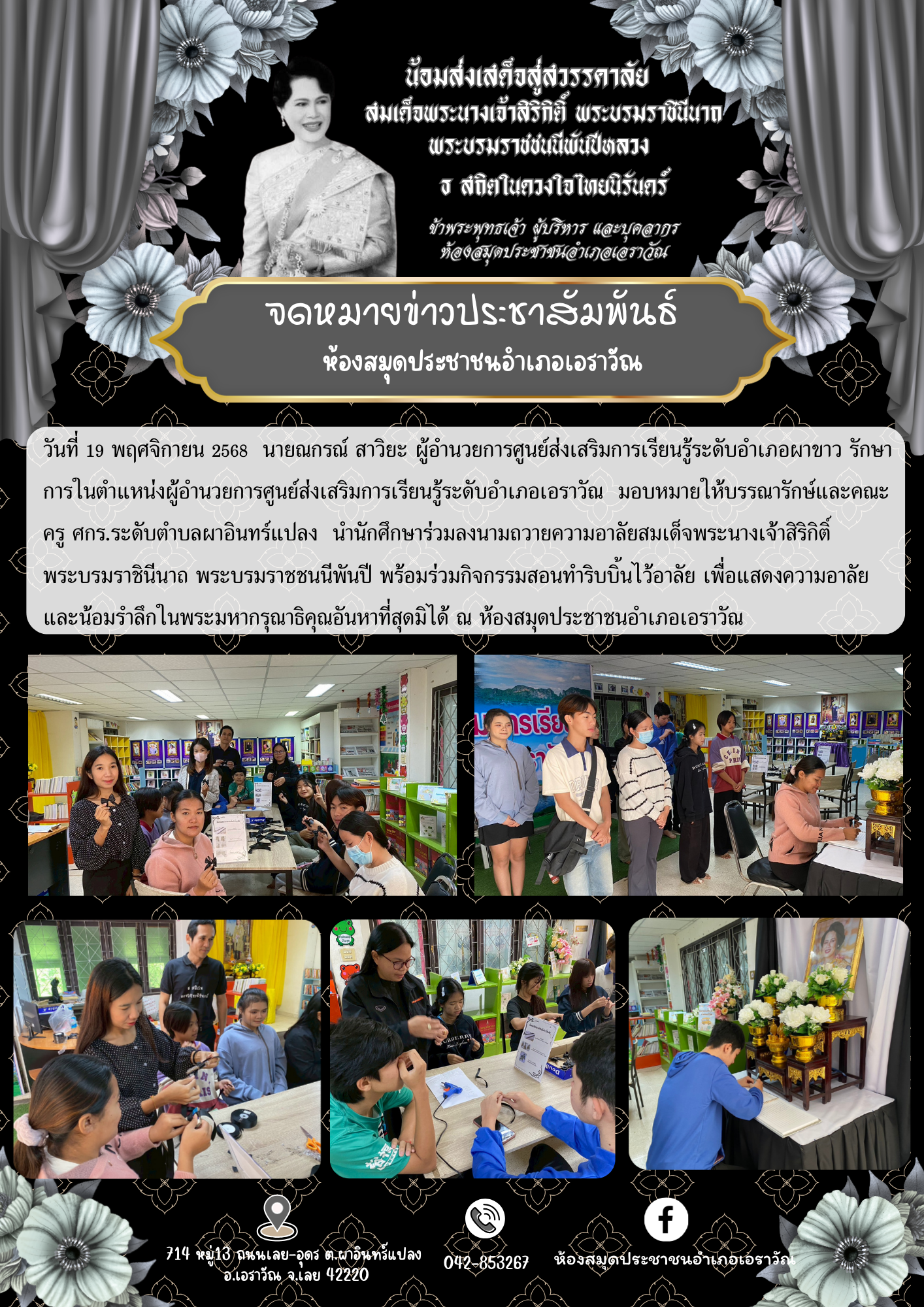 ศกร.ระดับตำบลผาอินทร์แปลง นำนักศึกษาร่วมลงนามถวายความอาลัยสมเด็จพระนางเจ้าสิริกิติ์ พระบรมราชินีนาถ พระบรมราชชนนีพันปี พร้อมร่วมกิจกรรมสอนทำริบบิ้นไว้อาลัย เพื่อแสดงความอาลัย และน้อมรำลึกในพระมหากรุณาธิคุณอันหาที่สุดมิได้ ณ ห้องสมุดประชาชนอำเภอเอราว