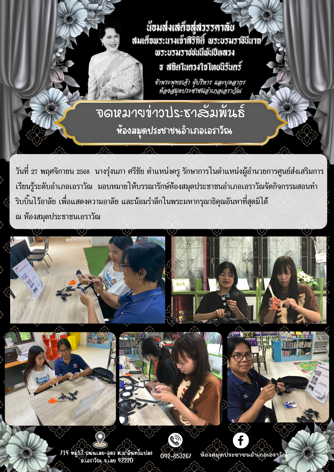 วันที่ 27 พฤศจิกายน 2568 นางรุ่งนภา ศรีชัย ตำแหน่งครู รักษาการในตำแหน่งผู้อำนวยการศูนย์ส่งเสริมการเรียนรู้ระดับอำเภอเอราวัณ มอบหมายให้บรรณารักษ์ห้องสมุดประชาชนอำเภอเอราวัณจัดกิจกรรมสอนทำริบบิ้นไว้อาลัย เพื่อแสดงความอาลัย และน้อมรำลึกในพระมหากรุณาธิ