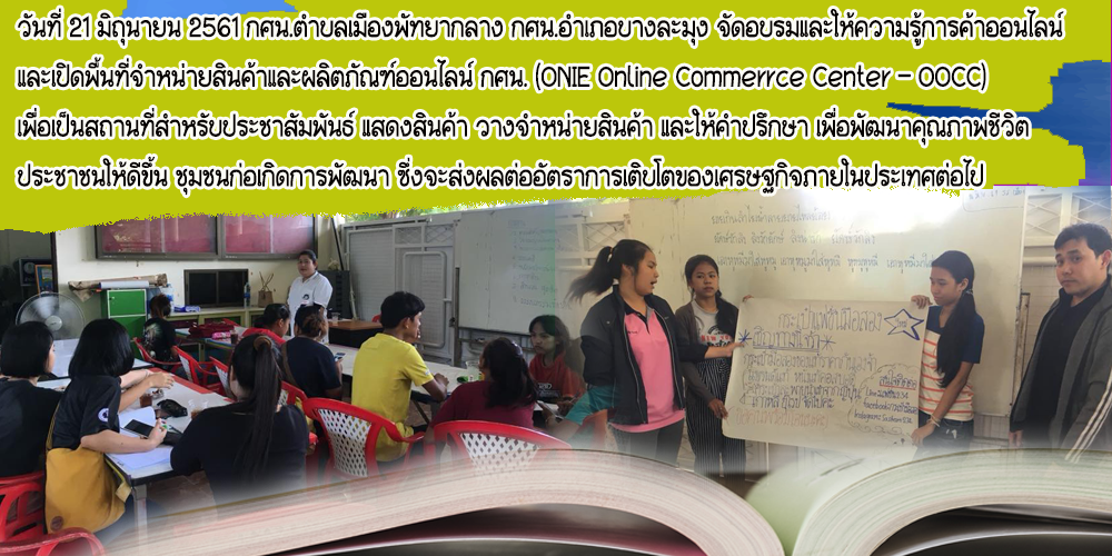| วันที่ 21 มิถุนายน 2561 กศน.ตำบลเมืองพัทยากลาง กศน.อำเภอบางละมุง จัดอบรมและให้ความรู้การค้าออนไลน์ และเปิดพื้นที่จำหน่ายสินค้าและผลิตภัณฑ์ออนไลน์ กศน. |
