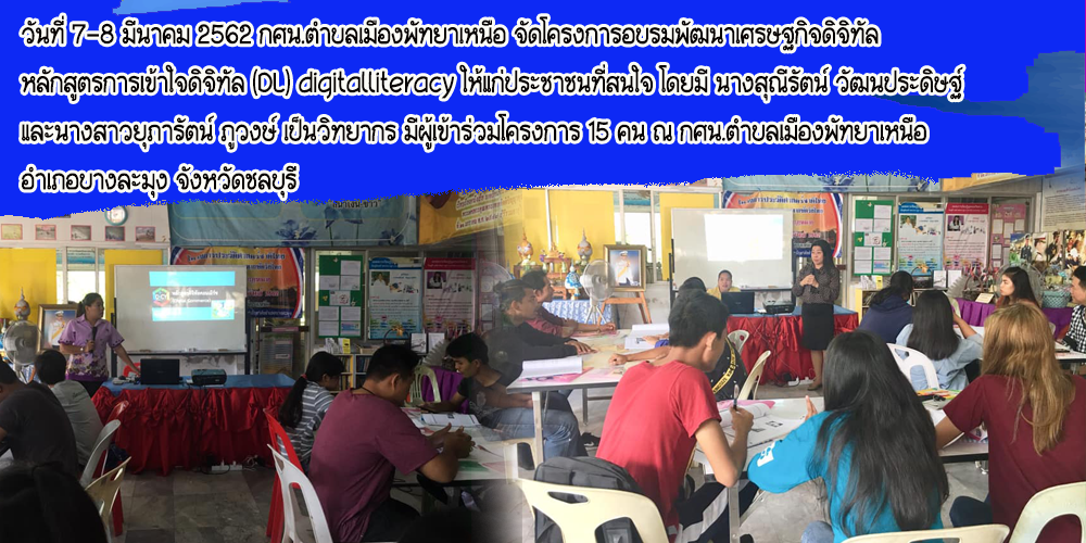 | วันที่ 7-8 มีนาคม 2562 กศน.ตำบลเมืองพัทยาเหนือ จัดโครงการอบรมพัฒนาเศรษฐกิจดิจิทัล หลักสูตรการเข้าใจดิจิทัล (DL) digitalliteracy |