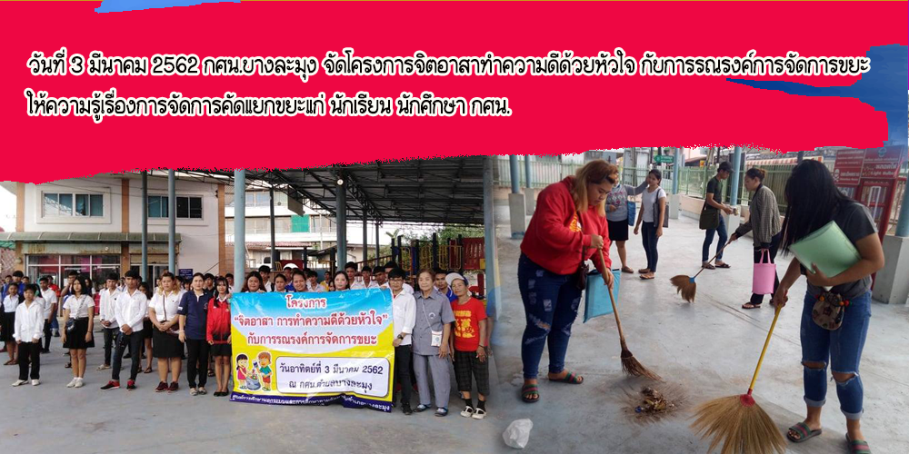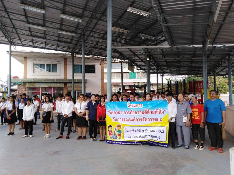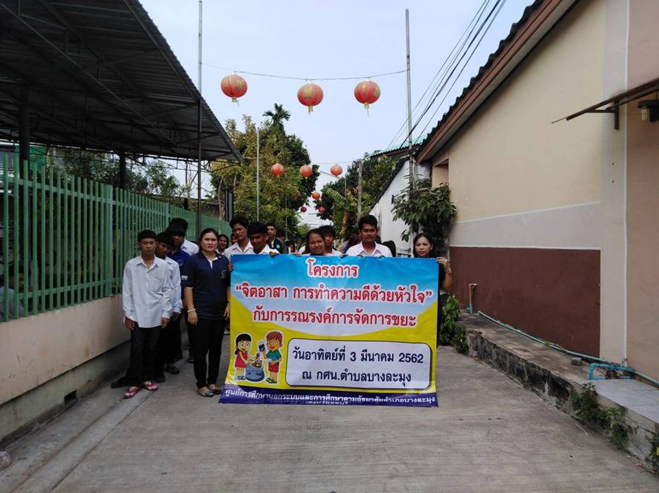 | วันที่ 3 มีนาคม 2562 กศน.บางละมุง จัดโครงการจิตอาสาทำความดีด้วยหัวใจ กับการรณรงค์การจัดการขยะ ให้ความรู้เรื่องการจัดการคัดแยกขยะ |