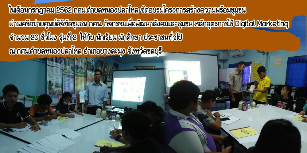 | กศน.ตำบลหนองปลาไหล จัดอบรมโครงการสร้างความพร้อมชุมชนผ่านเครือข่ายศูนย์ดิจิทัลชุมชน กศน. กิจกรรมเพื่อพัฒนาสังคมและชุมชน หลักสูตรการใช้ Digital Marketing จำนวน 20 ชั่วโมง รุ่นที่ 2 |