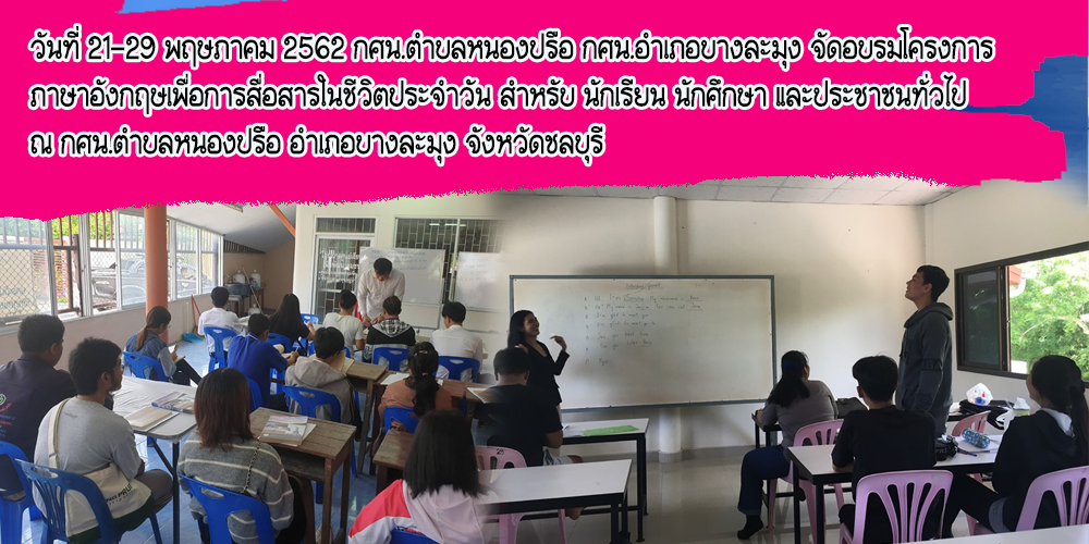 | วันที่ 21-29 พฤษภาคม 2562 กศน.ตำบลหนองปรือ กศน.อำเภอบางละมุง จัดอบรมโครงการภาษาอังกฤษเพื่อการสื่อสารในชีวิตประจำวัน สำหรับ นักเรียน นักศึกษา และประชาชนทั่วไป ณ กศน.ตำบลหนองปรือ อำเภอบางละมุง จังหวัดชลบุรี |