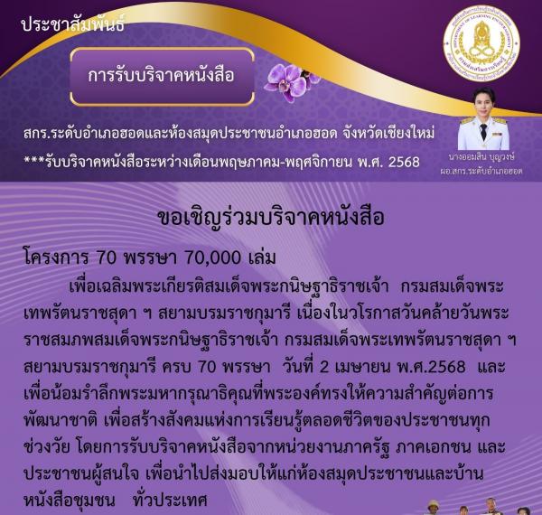 ห้องสมุดประชาชนอำเภอฮอด สกร.ระดับอำเภอฮอด ขอเชิญชวนพสกนิกรชาวไทย ชมนิทรรศการหนังสือออนไลน์ พร้อมลงนามถวายพระพรออนไลน์ ๒ เมษายน วันคล้ายวันพระราชสมภพ เฉลิมพระเกียรติ