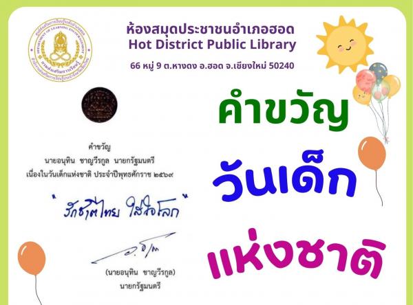 คำขวัญวันเด็กแห่งชาติ ประจำปี 2565 รู้คิด รอบคอบ รับผิดชอบต่อสังคม : ห้องสมุดประชาชนอำเภอฮอด