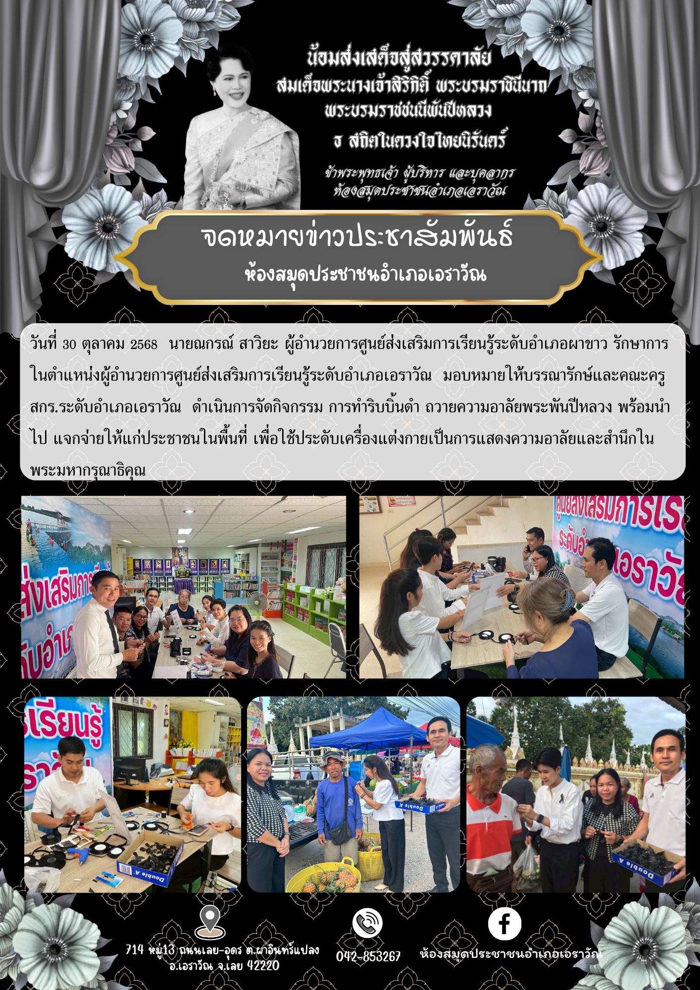 ศกร.ระดับตำบลผาอินทร์แปลง นำนักศึกษาร่วมลงนามถวายความอาลัยสมเด็จพระนางเจ้าสิริกิติ์ พระบรมราชินีนาถ พระบรมราชชนนีพันปี พร้อมร่วมกิจกรรมสอนทำริบบิ้นไว้อาลัย เพื่อแสดงความอาลัย และน้อมรำลึกในพระมหากรุณาธิคุณอันหาที่สุดมิได้ ณ ห้องสมุดประชาชนอำเภอเอราว