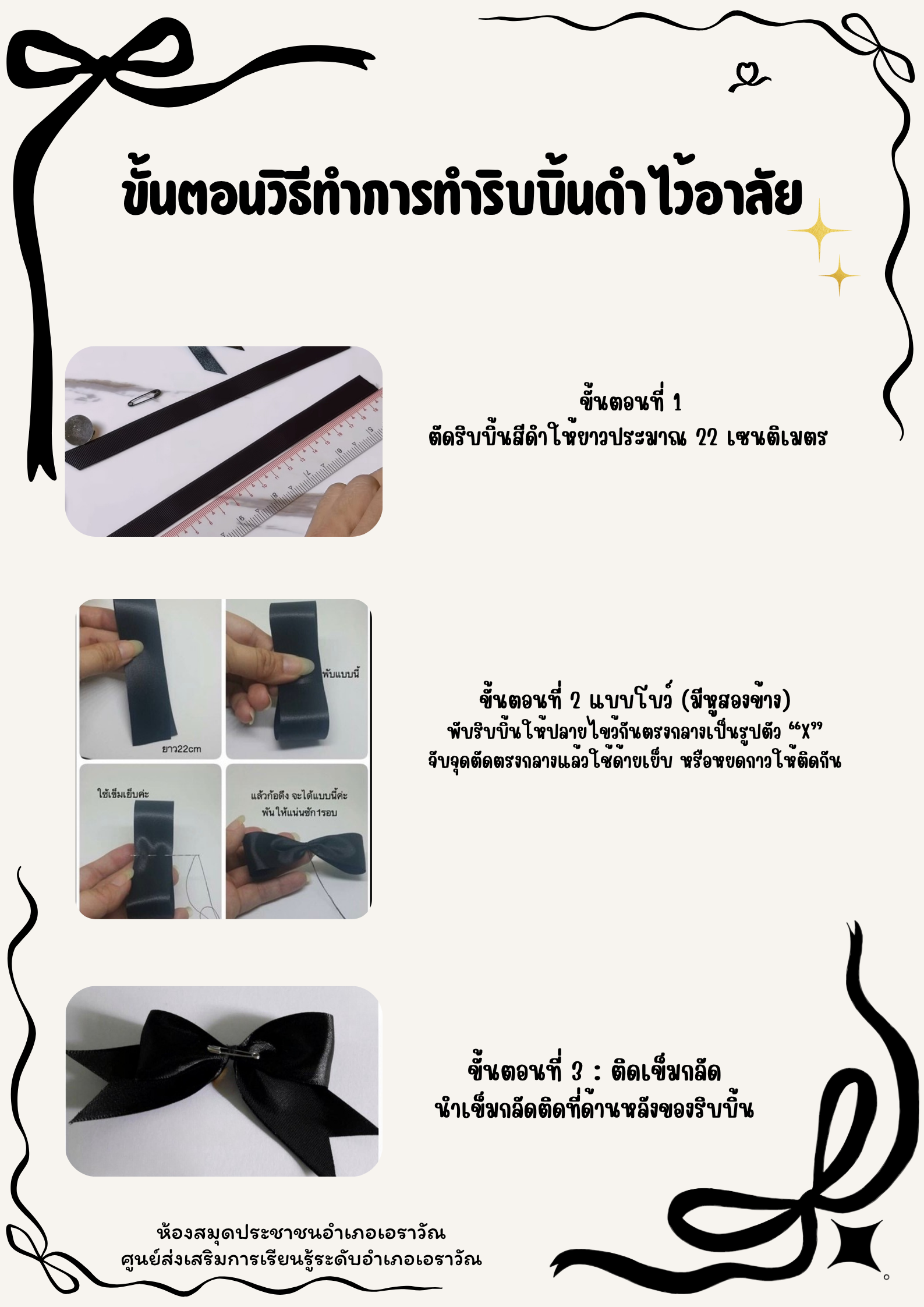 กิจกรรมสอนทำริบบิ้นไว้อาลัย ให้กับประชาชนทั่วไป เพื่อแสดงความไว้อาลัยสมเด็จพระนางเจ้าสิริกิติ์ พระบรมราชินีนาถ พระบรมราชชนนีพันปีหลวง ณ ห้องสมุดประชาชนอำเภอเอราวัณ