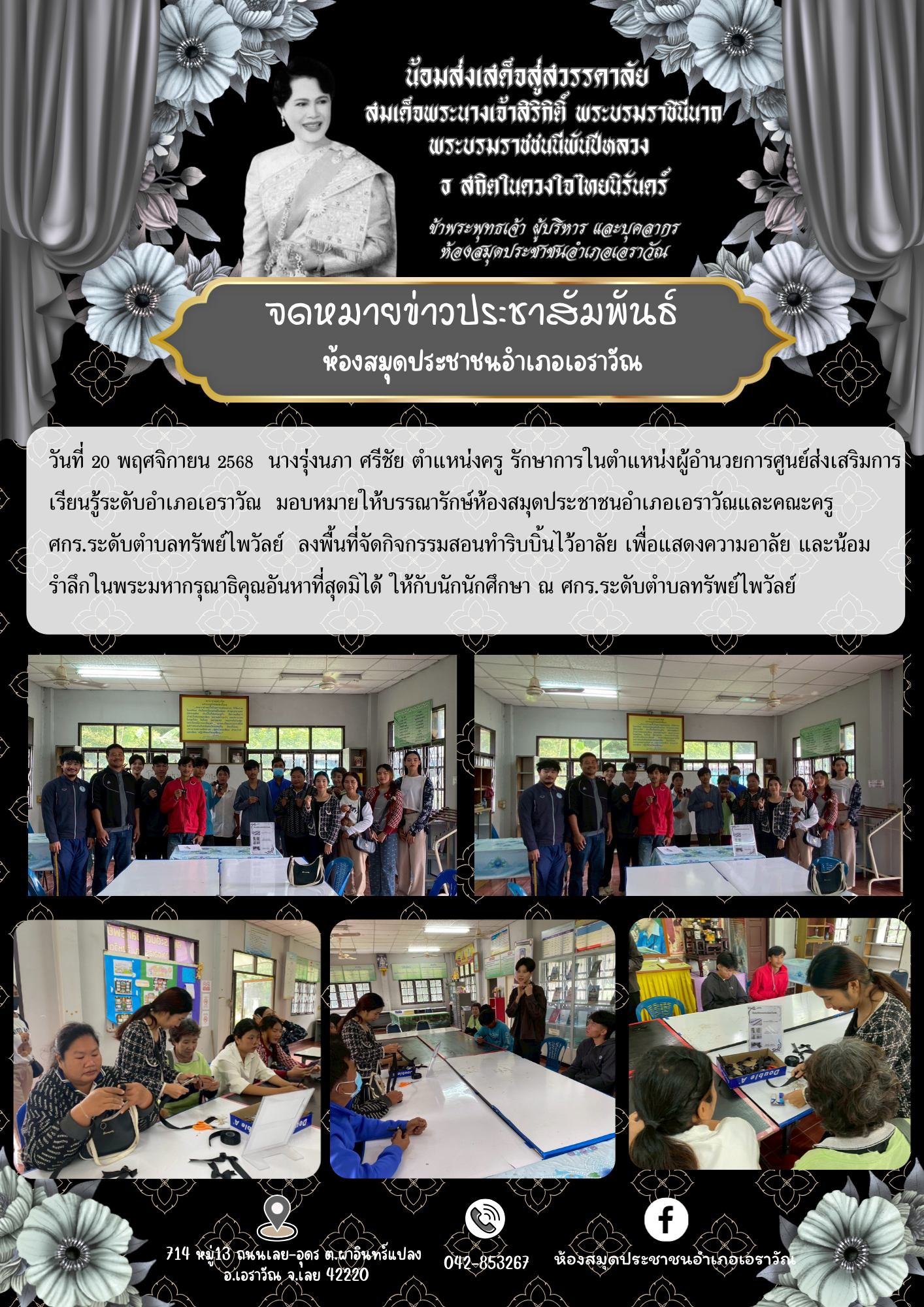 วันที่ 20 พฤศจิกายน 2568 นางรุ่งนภา ศรีชัย ตำแหน่งครู รักษาการในตำแหน่งผู้อำนวยการศูนย์ส่งเสริมการเรียนรู้ระดับอำเภอเอราวัณ มอบหมายให้บรรณารักษ์ห้องสมุดประชาชนอำเภอเอราวัณและคณะครู ศกร.ระดับตำบลเอราวัณ ลงพื้นที่จัดกิจกรรมสอนทำริบบิ้นไว้อาลัย เพื่อ