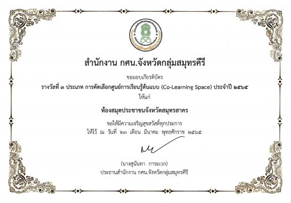 รางวัลที่ 3 ประเภท การคัดเลือกศูนย์การเรียนรู้ต้นแบบ (Co-Learning Space) ประจำปี 2565